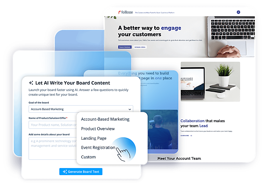 Generative AI is offering unique opportunity to leverage the power of AI to generate landing pages and micro-sites to describe a product, solution or a campaign, targeting a specific role, audience or account. The Folloze GeneratorAI is an easy to use tool to generate the board text, see this demo. You will need minimal to no training. Here are a few steps to follow: