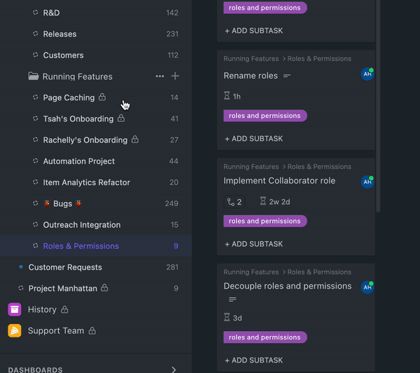 - Tag your project tasks with the same tag (For example. "outreach", "roles and permissions"). This will allow QA or any other person to open tickets and automatically create visibility on your project board.