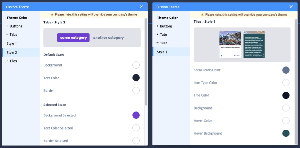 *Custom Theme editor details for category tabs (left) and content item tiles (right).