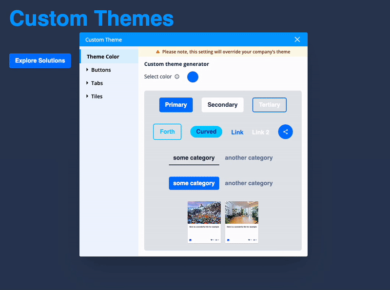 You can dig deeper into the Custom Theme tool and adjust the exact colors used on any of the 8 buttons, 2 tab styles, or content item tiles. This allows you to adjust what is auto-generated or even combine some aspects of your brand standards with those of your partners and/or target accounts.