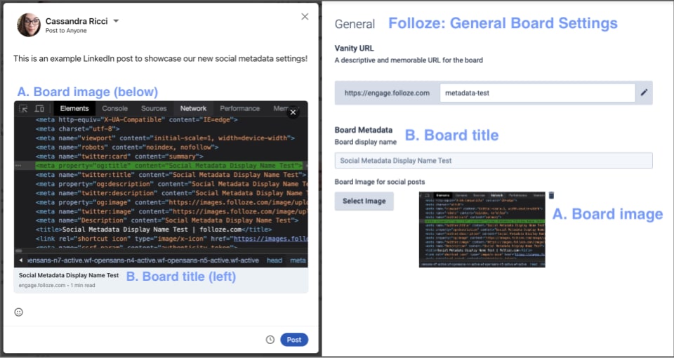 *A LinkedIn Post (left) & Folloze Board Settings (right) with image (A) and title (B).
