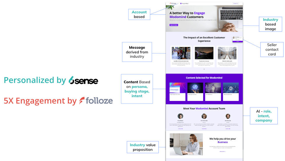 Folloze taps into the power of 6sense data to dynamically personalize any digital destination for the entire B2B buyers journey, across inbound and outbound channels. The result? Deeper account engagement, increased campaign effectiveness and more pipeline.